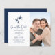 This elegant navy blue tropical beach wedding BUDGET save the date card features two palm trees above the text, stylish handwriting script for the “Save the Date” announcement, and a photo of the happy couple.