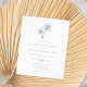This budget coastal wedding invitation is a smaller size printed on cheaper paper, without an envelope. The simple minimal tropical beach wedding invitation features two palm trees at the top, with classic elegant text, in a white and dusty blue color scheme, with coordinating dusty blue on the back.