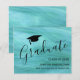 This modern graduation announcement features a graduation cap on a turquoise background.