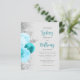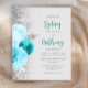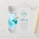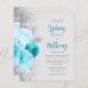 The left-hand edge of this elegant modern wedding invitation features a floral bouquet in shades of turquoise and light blue, trimmed with silver faux foil and faux glitter foliage and sprinkled with silver faux glitter. The customisable text combines turquoise calligraphy script with charcoal grey sans serif font on a pale silver grey background. The reverse side features a matching turquoise and silver floral design.