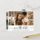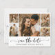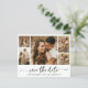 Budget Elegant Modern Black and White Minimalist Calligraphy Script 5 Photo Collage Wedding Save The Date Thin Cards. This romantic delicate design perfect for modern wedding. Features 5 (five) grid photo collage, a whimsical calligraphy in hand lettered style swash tail font. Easy to personalise it with your wedding details and pictures. Low budget cheap affordable cards.