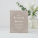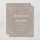 This elegant wedding invitation pairs a beautiful vintage typeface with sans serif font. The white text is framed by a thin oval surrounded by delicate botanical vine motifs in the corners, on a taupe background. The frame is repeated on the reverse, enclosing a pair of monogram initials.
