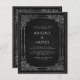 This elegant wedding invitation features an ornate vintage silver frame on a distressed off-black background in imitation of an antique book cover. Customise the silver grey text with your names and wedding details. The frame design is repeated on the back of the card.
