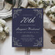 This elegant vintage-inspired birthday party invitation features the text in silver grey script and serif fonts on a dark navy blue background, framed by ornate decorative silver grey motifs in all four corners. The corner motifs are repeated on the reverse.