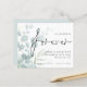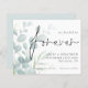 We Decided on Forever Eucalyptus Save The Date. A budget price SMALLER 4.5” x 5.6” alternative. Available in a SEMI-GLOSS 110 lb CARD STOCK which is the default option (thicker for invitations), OR a SATIN FINISH 80 lb THINNER PAPER STOCK (ideal for enclosures). Envelopes are an optional extra and are slightly larger than the card size. Delicate eucalyptus leaves in powder blue from the left and gradually tinted into the background with text overlapping slightly and to the right. Forever is set in a stylish script and the rest of the text you can easily personalise. A coordinating background is on the back.