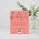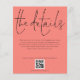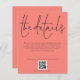 Wedding Details QR Code Script Coral Rose enclosure. A budget price SMALLER 4.5” x 5.6” alternative. Available in a SEMI-GLOSS 110 lb CARD STOCK which is the default option (thicker for invitations), OR a SATIN FINISH 80 lb THINNER PAPER STOCK (ideal for enclosures). Add your QR code to your wedding website. Let your guests know details such as directions and accommodation information for your wedding when you send their invitations. This elegant design has set stylish large typography for the heading The Details and the rest of the text can be easily personalised to your words along with your website QR code. You can choose any colours of your choice for the text and background colours on both sides via the customise further option.