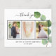 Add 3 of your own photos and a thank your note. A classic white background with black text and frame, eucalyptus sprig. The text: Thank you on the front and your names on the back are written with a stylish hand lettered script with swashes.