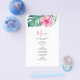 These budget wedding menu sheets features a unique watercolor hibiscus flower and monstera palm leaf in shades of vibrant pink and green. The page reverses to a matching colour. Use the template fields to DIY your custom wedding dinner menu. A tropical island chic choice for destination weddings, a bridal shower, rehearsal dinners or whatever you like. To see more menu cards for wedding catering visit www.zazzle.com/dotellabelle