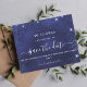 A modern and elegant Save the Date for a wedding. A navy blue background decorated with faux silver glitter dust. Personalise and add a date and names. The text: Save the Date is written with a large trendy hand lettered style script.