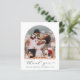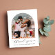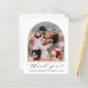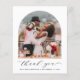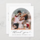 Budget-friendly wedding thank you card for newlyweds featuring your photo in a modern arched picture frame, "thank you" in an elegant script and your Mr & Mrs name and wedding date in simple typography. On the reverse, you can personalise a thank you message and add your first names as a signature.
