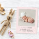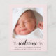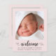 A cute budget-friendly pastel pink baby girl birth announcement. The front features her photo, name, arrival date and birth stats, and "welcome" in a stylish script with heart swashes. On the reverse, add an additional photo, parent and sibling names, and a personalised thank you or other message.