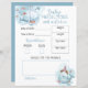 Budget blue and white whale boy baby shower "predictions and advice" paper sheets. To personalise it or change the text, colours, and fonts please click the button to edit the design. Includes the date of birth, time, weight, length, eye colour, hair colour, resemblance, and space to add a message of advice for the new parents.