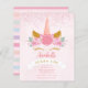 A modern, girly and whimsical first birthday invitation designed with a cute unicorn horn, blush pink floral and curly smiling eyelashes and a chic calligraphy lettering of the birthday girl's name with a sprinkle of delicate rose gold glitter on the top centre. The back of the invite features a pastel coloured rainbow stripes.
