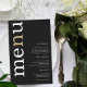 Simple White Gold Typography Black Wedding Menu. A budget price size 5.5” x 8.5”, on an elegant 110 lb LINEN stock – for a luxury feel at great value, this is perfect for menus, as well as invitations and programs etc. This budget size alternative is also available in other paper choices. The SEMI-GLOSS 110 lb card stock is about the same thickness as a postcard, so also works well for invitations. The FELT 100 lbs paper is buff coloured, NOT white, so adds a rustic touch. The MATTE 80lbs paper stock is bright white, for crisp printing, great for your menus and programs, whilst the SATIN 80lbs paper is thin and light A modern typographical design with Menu in large typography in white with the ”n” in gold rotated and to the left hand side on a black background.