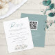 A value for money BUDGET alternative on a size 4.5 x 5.6” semi-gloss 110lbs weight, which is of similar thickness to a postcard (however is not suitable to use as a postcard.). PLEASE NOTE there is ONE per sheet. Budget White Pumpkins QR Code Wedding RSVP. Give your guests the choice to reply by posting or via your website with this minimalist autumnal design with white florals, pumpkins and teal foliage. RSVP is in a modern set script and easily personalise the rest of the text. For convenience of your guests to reply either by sending this back to you or alternatively to reply online. Add your QR code to your reply page on your wedding website on the back by replacing the QR code on the sample. You can create QR codes for free online. Simply search “QR code creator” and lots of options come up to create for free.