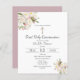 Customisable affordable paper, first holy communion invitation, featuring pretty blush white rose floral bouquets on a clean white background with an ornate gold effect cross and a dusty blush pink reverse.