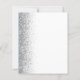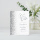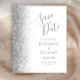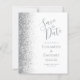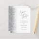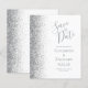 The left-hand edge of this elegant modern wedding save the date card features a silver faux glitter border. The customisable text combines grey handwriting, copperplate and italic fonts on a white background. The reverse side features a matching white and silver design.