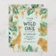 Celebrate your little wild one's first birthday with this jungle safari themed invitation, featuring gold faux foil animals (giraffe, lion and monkeys), gold and green jungle foliage, and a sprinkling of gold confetti. Add your child's name and party details in black text on a pale green background. A coordinating jungle foliage pattern in green and gold decorates the back of the card.