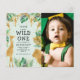 Invite guests to celebrate your child's first birthday with this jungle safari themed invitation, featuring a a collection of green and gold faux foil jungle foliage and animals (giraffe, lion, monkey) surrounding the words "Wild One" in hand drawn typography on a pale green background. Easily replace the sample image with your favourite photo of the birthday boy or girl. The back of the card features a green and gold jungle foliage pattern.