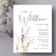 An elegant budget-friendly baby girl shower invitation that features "a little wildflower is on her way" in a mix of modern soft grey typography and a stylish purple script, and a boho-inspired watercolor bouquet of dainty purple, pink and yellow wildflowers.