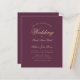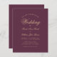 A simple, minimalist budget wedding invitation. It has only golden yellow text on wine colour (close to burgundy) background. The word Wedding and the names are written in an elegant calligraphic script.