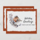 A cute rust and grey coloured winter robin sits on a branch of white and green leaves against a snowy white deckled edge paper background. The design itself is overlaid on a warm rust colour drawn from the bird's own feathers. The example text on front of our budget new address Christmas card reads "Holiday greetings from our new home." This text and all text on back of the card can be revised easily - or deleted for hand-writing - via the personalisation template.