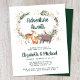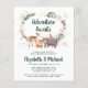 Cute budget-friendly rustic winter couple's baby shower invitation featuring watercolor illustrations of woodland animals, florals, greenery and gold stars and snowflakes. "Adventure Awaits" and the parent-to-be names are written in a forest green script.