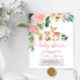 Woodland baby shower invitation featuring green leaves & pink watercolor roses and a group of adorable forest animals