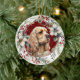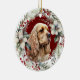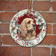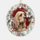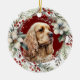 On the front of this Holiday ornament is the image of a beautiful buff American Cocker Spaniel Dog. The portrait is on a Christmas red background, and framed within a rustic twig, red berry, white floral and green leaf wreath. On the back, red and green text says MERRY CHRISTMAS" and "HAPPY NEW YEAR". The text is in customisable text fields, so you may make it say whatever you'd like.