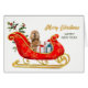 On this Holiday card, a buff colored Cocker Spaniel Dog sits in a pretty red and gold decorative sleigh. Beside the dog sits gift packages tied with colorful bows, and behind the sleigh is holly with red berries. The gold script text at the right says "MERRY CHRISTMAS" and your custom text is in green. All the text, inside and out, may be easily changed to anything you'd like. You can see more dog breed images and products at Dog Village.