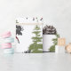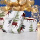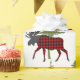 Bull moose wearing red and black tartan walking through green pine trees. White background, customise as you wish.