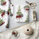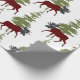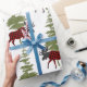 Bull moose wearing red and black tartan walking through green pine trees. White background, customise as you wish.