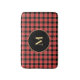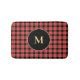 This fully customisable bath mat is embellished with a modified version of a classic buffalo check pattern in red and black with a yellow line accent. This design was created with an SVG image in which all of the elements as well as the circle and monogram text feature colours that may be customised by the buyer to any hue to coordinate with their décor.