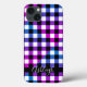 Personalise this fun, colourful purple, pink, blue, black and white buffalo check plaid cell phone case with your name or custom text shown in an editable modern, trendy handwritten script font. The font style, size and colour can be changed by clicking on the CUSTOMIZE FURTHER tab in the PERSONALIZE section. ASSISTANCE: For help with design modification/personalisation, colour change or transferring the design to another product, contact the designer BEFORE ORDERING via the Zazzle Chat MESSAGE tab or email makeitaboutyoustore@gmail.com.