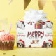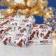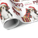 The repeated pattern on this cute Christmas wrapping paper is an image of an adorable Beagle pup wearing a red and white Santa hat, with a black and red buffalo plaid pillow behind him, and a coordinating gift package with a gold ribbon beside him. There's also a buffalo plaid bow and the matching text that says "JOY". Stylised red and black buffalo plaid text says MERRY CHRISTMAS", and your own signature is in two fields for you to customise.