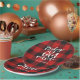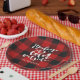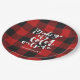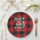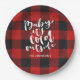 Holiday paper plate features red buffalo check plaid with white brush script "baby it's cold outside" typography. A trendy addition to your holiday party.