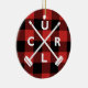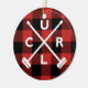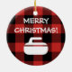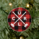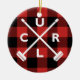 Christmas ornament featuring crossed curling brooms and curling rock on red buffalo plaid background. Perfect for curlers and curling fans.