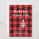 This front Christmas design features a wreath with white Christmas tree shape ornament with party template text on the back red and black buffalo plaid as a background. Personalise or remove the template text or click customise to select a font style, size, and colour you prefer.
