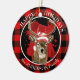 An image of an antlered buck deer wearing a red and white striped Santa hat is at the center of this Christmas ornament. The image is placed on a bright red paint splatter background and framed in white. The text, also in white, has your name and address on a red and black buffalo plaid circle border. The back of the ornament has the same image, with one more text field for you to customize.
