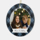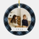 A sweet double sided photo ornament displaying a favorite photo on each side, on a blue and black buffalo plaid background. Personalize with a custom caption on the front in handwritten lettering, and add the year to the back.