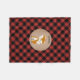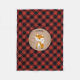 A fleece blanket featuring an illustration of a fox. Background is black and red buffalo plaid. Personalise the name.