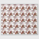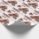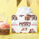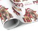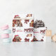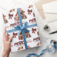 The repeated pattern on this cute Christmas wrapping paper is an image of a brown Labradoodle Dog wearing a red and white Santa hat, with a black and red buffalo plaid pillow behind him, and a coordinating gift package with a gold ribbon beside him. There's also a buffalo plaid bow and the matching text that says "JOY". Stylised red and black buffalo plaid text says MERRY CHRISTMAS", and your own signature is in two fields for you to customise.