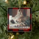 Buffalo Plaid Black and Red Check Merry Christmas Ornament with pet cat photos and names with cute and funny "meowy christmas" wording.