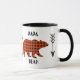 If your Dad is a proud "Papa Bear", this is an appropriate mug for any occasion, but especially for Father's Day or his birthday. A red and black buffalo plaid silhouette bear image walks between two opposing black arrows. The black text below and above the bear image says "Papa Bear". The image and text are repeated on two sides of the mug.