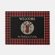 A buffalo plaid silhouette antlered deer head is at the centre of a tan circle on this attractive door mat. Opposing black arrows are on each side of the head. The circle is placed on a black background, which is framed with a matching red and black buffalo plaid border. Your custom text is in matching tan above and below the circle and deer image. Perfect for a cabin, or country home, but comfortable at home in the city, too!