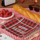 Red and black buffalo plaid pattern with silver Christmas tinsel.
