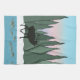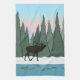Super cool stylised winter scene featuring an elk in silhouette, fish swimming in the river, evergreen forest and a beautiful early morning or late afternoon sky. By Melissa J Barrett