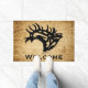 Personalise this Unique "One of a Kind" Bull Elk Door Mat! It Features a Majestic Bugling Bull Elk Black Silhouette...on a Stressed Wood Background!