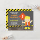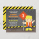 A construction theme birthday party offers lots of fun for birthday boys who love construction toys and machines because they are so many party ideas to work with on this theme! This construction theme invitation has a cute boy in construction outfit made up of safety hat, orange vest and yellow boots. He is holding on to an orange sign which you can personalise with the child's age. A yellow and black slanted stripes pattern which is used for construction zones and barriers. Children guests are going to be so happy and excited to receive this invitation!