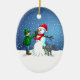 The boy has built a snowman that his dog stands and urinates on while the boy gives the snowman a carrot nose.